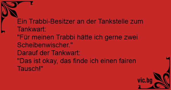 Scheibenwischer für den Dacia Мъж в магазин за авточасти: A guy walks into an auto shop and says, "I'd like a gas cap for my KIA." The car mechanic thinks for a few seconds then says, "Ok, that seems like a fair trade." An der Tankstelle: "Ich hätte gern zwei Scheibenwischer für meinen Trabant." Antwort: "Guter Tausch!" Dans une station-service, un mec demande à la caisse : - Pourrais-je avoir un jerricane d'essence pour ma Renault ? - Oui... Cela me parait être un bon troc. Kommt ein Trabibesitzer in eine Autowerkstatt. „Ich hätte gern 2 Scheibenwischer für meinen Trabi“. Meint der Werkstattbesitzer: „Ein fairer Tausch“. Lada-rijder bij de garage: "Een achteruitkijkspiegeltje voor mijn Lada, a. U. B! " Verkoper: "Oke, dat is een eerlijke ruil!" Komt een man bij de garage met z'n Lada. Man: Ik wil graag twee nieuwe ruitenwissers voor m'n Lada. Garage monteur: Ja, da's een goede ruil, ok.