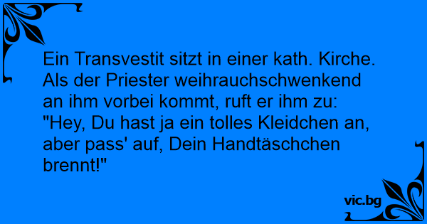 Ein Transvestit sitzt in einer kath. Kirche. Als der Priester weihrauchschwenkend an ihm vorbei kommt, ruft er ihm zu: