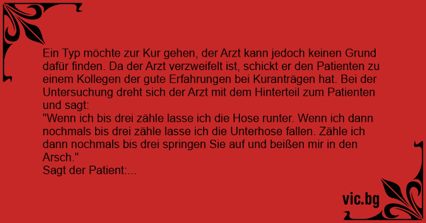 Ein Typ möchte zur Kur gehen, der Arzt kann jedoch keinen Grund dafür finden. Da der Arzt verzweifelt ist, schickt er den Patienten zu einem Kollegen der gute Erfahrungen bei Kuranträgen hat. Bei der Untersuchung dreht sich der Arzt mit dem Hinterteil zum Patienten und sagt: