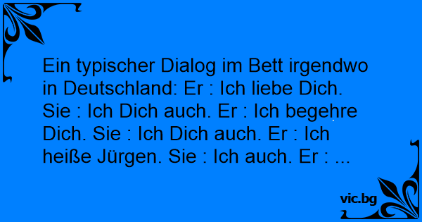 Ein typischer Dialog im Bett irgendwo in Deutschland: Er : Ich liebe Dich. Sie : Ich Dich auch. Er : Ich begehre Dich. Sie : Ich Dich auch. Er : Ich heiße Jürgen. Sie : Ich auch. Er : ...