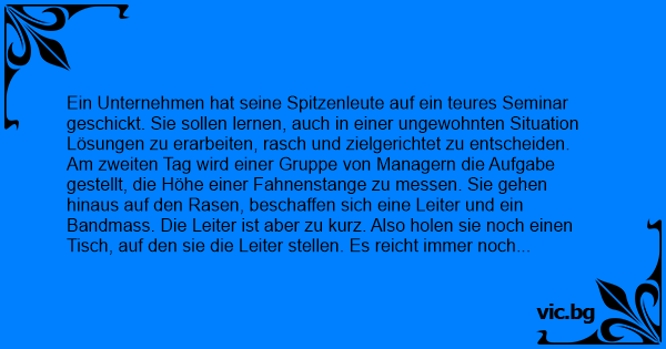 Am zweiten Tag wird einer Gruppe von Managern die Aufgabe gestellt, die Höhe einer Fahnenstange zu messen. Sie gehen hinaus auf den Rasen, beschaffen sich eine Leiter und ein Bandmass. Die Leiter ist aber zu kurz. Also holen sie noch einen Tisch, auf den sie die Leiter stellen. Es reicht immer noch niсhт. Sie stellen noch einen Stuhl auf den Tisch. Da das alles sehr wackelig ist, fällt der ganze Aufbau immer wieder um. Alle reden gleichzeitig. Jeder hat andere Vorschläge zur Lösung des Problems. Es ist ein heilloses Durcheinander.