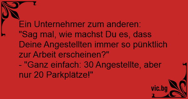 Ein Unternehmer zum anderen: "Warum sind deine Arbeiter immer so pünktlich?" "Einfacher Trick: 30 Arbeiter, aber nur 20 Parkplätze!"