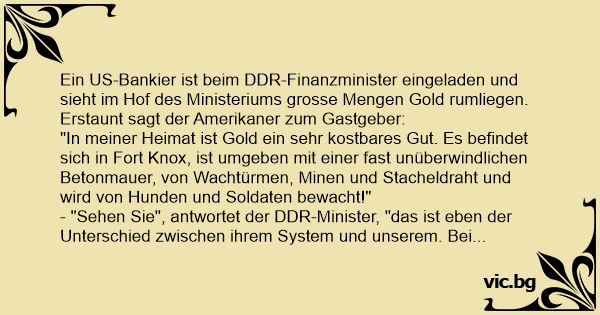 Ein US-Bankier ist beim DDR-Finanzminister eingeladen und sieht im Hof des Ministeriums grosse Mengen Gold rumliegen. Erstaunt sagt der Amerikaner zum Gastgeber: