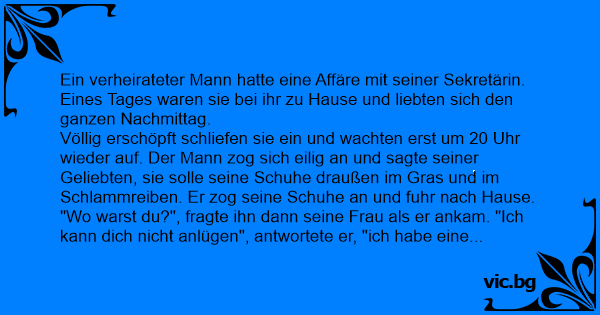Völlig erschöpft schliefen sie ein und wachten erst um 20 Uhr wieder auf. Der Mann zog sich eilig an und sagte seiner Geliebten, sie solle seine Schuhe draußen im Gras und im Schlammreiben. Er zog seine Schuhe an und fuhr nach Hause. "Wo warst du?", fragte ihn dann seine Frau als er ankam. "Ich kann dich niсhт anlügen", antwortete er, "ich habe eine Affäre mit meiner Sekretärin. Wir hatten den ganzen Nachmittag Sеx." Seine Frau sah hinunter auf seine Schuhe und sagte: