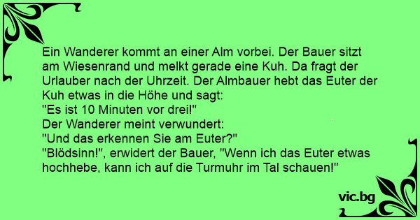 Ein Wanderer kommt an einer Alm vorbei. Der Bauer sitzt am Wiesenrand und melkt gerade eine Kuh. Da fragt der Urlauber nach der Uhrzeit. Der Almbauer hebt das Euter der Kuh etwas in die Höhe und sagt: