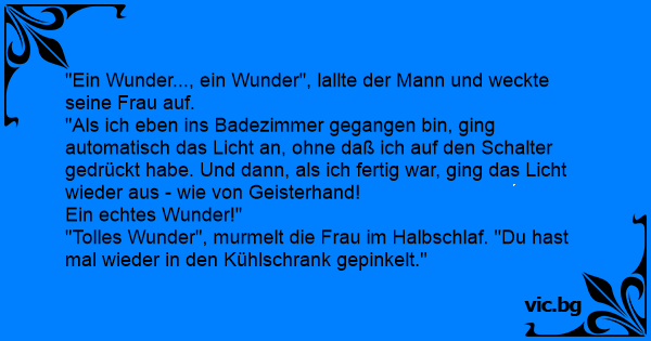 "Ein Wunder, o gott, ein Wunder!" ruft der Mann und rüttelt seine Frau wach. "Das geht doch nicht mit rechten Dingen zu. Stell dir vor, ich gehe ins Badezimmer, und von ganz alleine geht das Licht an. Und als ich fertig bin, geht das Licht wieder aus, ohne dass ich den Lichtschalter........"...