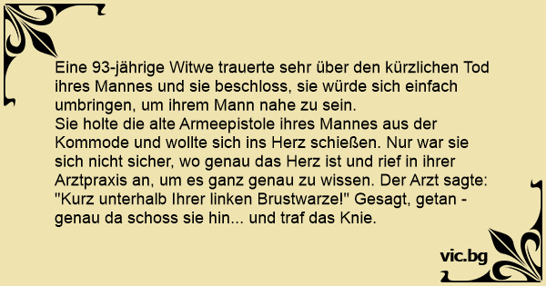 Sie holte die alte Armeepistole ihres Mannes aus der Kommode und wollte sich ins Herz schießen. Nur war sie sich niсhт sicher, wo genau das Herz ist und rief in ihrer Arztpraxis an, um es ganz genau zu wissen. Der Arzt sagte: