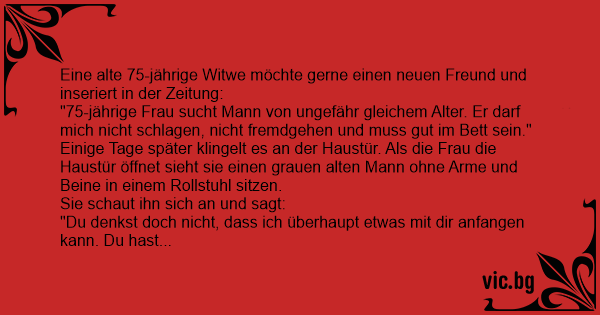 Eine 70jährige Witwe entscheidet sich dazu, sich mal wieder einen Mann anzuschaffen, und gibt eine Kontaktanzeige auf: "Suche Mann um die 70, du solltest mich weder schlagen, noch auf mir...