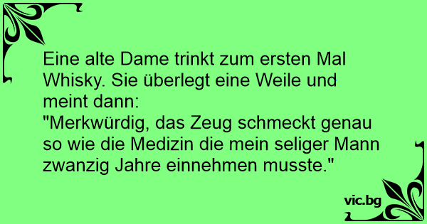 Eine alte Dame trinkt zum ersten Mal Whisky. Sie überlegt eine Weile und meint dann:
