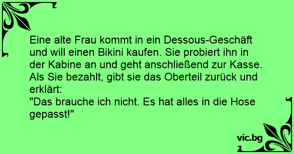Eine alte Frau kommt in ein Dessous-Geschäft und will einen Bikini kaufen. Sie probiert ihn in der Kabine an und geht anschließend zur Kasse. Als Sie bezahlt, gibt sie das Oberteil zurück und erklärt: