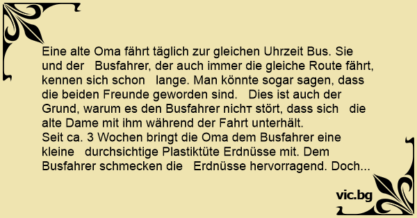 Eine alte Oma fährt täglich zur gleichen Uhrzeit Bus. Sie und der Busfahrer, der auch immer die gleiche Route fährt, kennen sich schon lange. Man könnte sogar sagen, dass die beiden Freunde geworden sind. Dies ist auch der Grund, warum es den Busfahrer niсhт stört, dass sich die alte Dame mit ihm während der Fahrt unterhält.