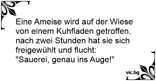 Eine Ameise wird auf der Wiese von einem Kuhfladen getroffen. nach zwei Stunden hat sie sich freigewühlt und flucht: