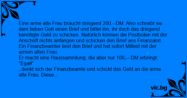 , denkt sich der Finanzbeamte und schickt das Geld an die arme alte Frau. Diese erhält den Brief und rennt sofort in die nächste Kirche um dem lieben Gott danke zu sagen. Sie betet ein Vater unser nach dem anderen. Als sie die Kirche wieder verlassen will, dreht sie sich noch einmal um und sagt: