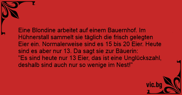 Eine Blondine arbeitet auf einem Bauernhof. Im Hühnerstall sammelt sie täglich die frisch gelegten Eier ein. Normalerweise sind es 15 bis 20 Eier. Heute sind es aber nur 13. Da sagt sie zur Bäuerin: