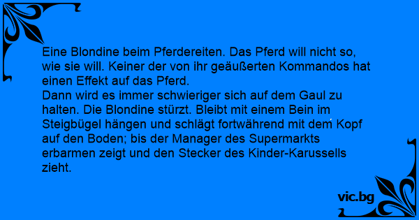Dann wird es immer schwieriger sich auf dem Gaul zu halten. Die Blondine stürzt. Bleibt mit einem Bein im Steigbügel hängen und schlägt fortwährend mit dem Kopf auf den Boden; bis der Manager des Supermarkts erbarmen zeigt und den Stecker des Kinder-Karussells zieht.