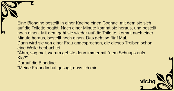 Eine Blondine bestellt in einer Kneipe einen Cognac, mit dem sie sich auf die Toilette begibt. Nach einer Minute kommt sie heraus, und bestellt noch einen. Mit dem geht sie wieder auf die Toilette, kommt nach einer Minute heraus, bestellt noch einen. Das geht so fünf Mal.