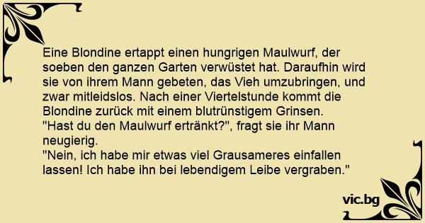 Eine Blondine ertappt einen hungrigen Maulwurf, der soeben den ganzen Garten verwüstet hat. Daraufhin wird sie von ihrem Mann gebeten, das Vieh umzubringen, und zwar mitleidslos. Nach einer Viertelstunde kommt die Blondine zurück mit einem blutrünstigem Grinsen.