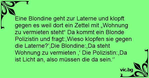 Eine Blondine geht zur Laterne und klopft gegen es weil dort ein Zettel mit „Wohnung zu vermieten steht“ Da kommt ein Blonde Polizistin und fragt:,Wieso klopfen sie gegen die Laterne?’‚Die Blondine:,Da steht Wohnung zu vermieten ‚‘ Die Polizistin:,Da ist Licht an, also müssen die da sein.‘’