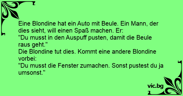 O blonda isi Gaseste masina din parcare cu portiera Infundata. Un trecator binevoitor o sfatuieste Sa sufle in teava de esapament pana Cand portiera revine la forma initiala. Blonda nu Sta mult pe...