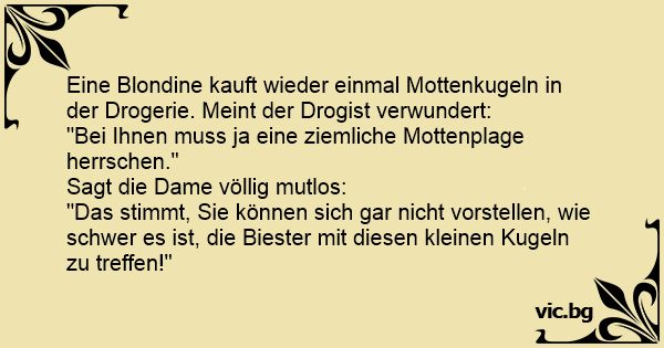 Eine Blondine kauft wieder einmal Mottenkugeln in der Drogerie. Meint der Drogist verwundert:
