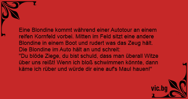 Eine Blondine kommt während einer Autotour an einem reifen Kornfeld vorbei. Mitten im Feld sitzt eine andere Blondine in einem Boot und rudert was das Zeug hält.