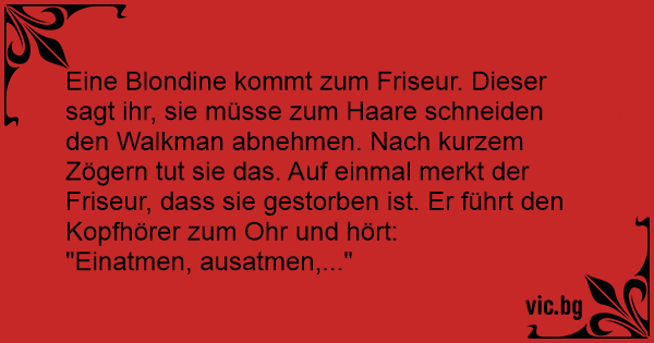 Im Friseurladen. Friseur: "Bitte den Kopfhörer abnehmen, sonst kann ich ihre Haare nicht schneiden. Blondine: "Neh, will ich nicht". Nach dem x-ten Versuch, die Haare trotzdem zu schneiden,...