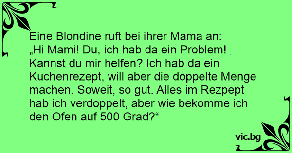 „Hi Mami! Du, ich hab da ein Problem! Kannst du mir helfen? Ich hab da ein Kuchenrezept, will aber die doppelte Menge machen. Soweit, so gut. Alles im Rezpept hab ich verdoppelt, aber wie bekomme ich den Ofen auf 500 Grad?“