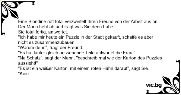 Eine Blondine ruft ihren Freund bei der Arbeit an. Sie sagt: „ich mache da ein Puzzle aber ich krieg es nicht hin.“ fragt der Freund „Hast du eine Vorlage?“ Sagt sie ja, da ist ein roter Hahn drauf...