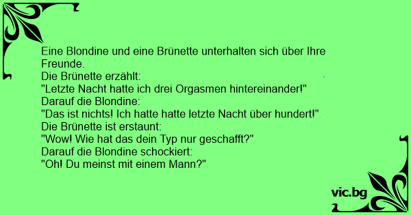 Blondýnka a brunetka si vyprávějí o svých partnerech. Bruneta povídá: „Poslední noc jsem měla tři orgasmy za sebou!” Blondýna na to: „To nic není, já jich měla včera v noci asi sto...!” Brunetka...