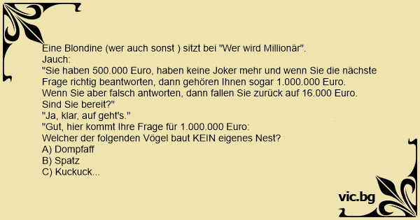 Kuckuck Една блондинка отива на конкурс и я питат: Se encuentra una rubia en un concurso de belleza y le hacen la siguiente pregunta: ¿Cuál de las siguientes aves no anida: el cuco, la cigüeña o el pavo real? La rubia selecciono el cuco y gano, muy sorprendido su amigo le dice: oye si eres inteligente ¿Cómo sabias que era el cuco? A lo que la... Blondynka grała w "Milionerach".Dostała pytanie : Który z wymienionych ptaków nie zakłada własnego gniazda : a)orzeł b)jaskółka c)szpak d)kukułka. Blondynka zdecydowanie każe zaznaczyć d)kukułka. Wygrała pieniądze. Spotyka ją koleżanka i mówi: - Słuchaj, skąd wiedziałaś, że to kukułka? A... - är det nån som kan säga en fågel som inte bygger sitt eget bo, frågar läraren sin lågstadieklass. En elev räcker upp handen och säger: - Kanariefågeln. Den bor ju i bur. - Ja, men den vilda kanariefågeln bygger bo. är det nån annan som vet? - Göken, säger en elev längst bak i... Lehrerin: "Warum baut der Kuckuck kein Nest?" Fritzchen: "Weil er in der Uhr wohnt!" Welcher Vogel baut kein Nest, fragt der Lehrer. Fritzchen meldet sich, und sagt: Der Kuckuck. Richtig, sagt der Lehrer. Und warum nicht, fragt er Fritzchen. Weil er in einer Uhr wohnt. Pistike, meg tudod nekem mondani, hogy melyik madárnak nincs fészke? - kérdi a tanár. - A kakukknak! - És miért? - Mert beköltözött a faliórába... Læraren: – Hvilken fugl bygger ikke reir? Eleven: – Gjøken. Læraren: – Riktig. Og hvorfor Bygger ikke gjøken reir? Eleven: – Den bor jo i gjøkur!