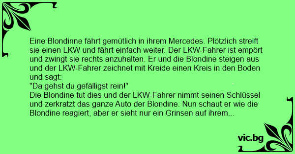 Eine Blondinne fährt gemütlich in ihrem Mercedes. Plötzlich streift sie einen LKW und fährt einfach weiter. Der LKW-Fahrer ist empört und zwingt sie rechts anzuhalten. Er und die Blondine steigen aus und der LKW-Fahrer zeichnet mit Kreide einen Kreis in den Boden und sagt: