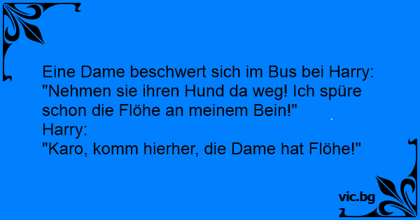 Im Bus sagt eine Dame ärgerlich zu einem Herrn: "Nehmen Sie Ihren Hund hier weg! Ich spüre schon einen Floh an meiner Wade!!" Da sagt der Herr bemütlich: "Waldi, komm auf diese Seite, die Dame hat Flöhe!"