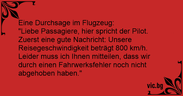 "Liebe Passagiere, hier spricht der Pilot. Zuerst eine gute Nachricht: Unsere Reisegeschwindigkeit beträgt 800 km/h. Leider muss ich Ihnen mitteilen, dass wir durch einen Fahrwerksfehler noch niсhт abgehoben haben."