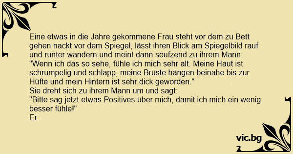 Kona står naken og ser seg selv i speilet. Hun sier til mannen: "Jeg er gammel, fet og stygg. Kan du ikke gi meg et kompliment?" Mannen: "Jo synet ditt er perfekt..."