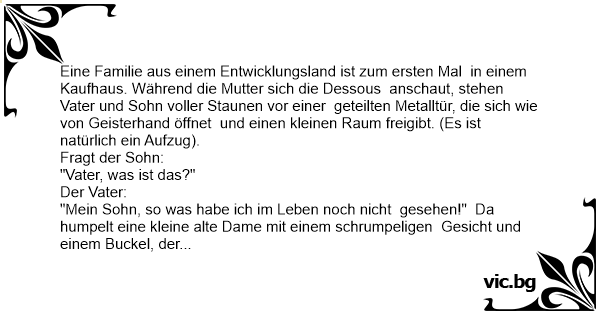 Eine Familie aus einem Entwicklungsland ist zum ersten Mal in einem Kaufhaus. Während die Mutter sich die Dessous anschaut, stehen Vater und Sohn voller Staunen vor einer geteilten Metalltür, die sich wie von Geisterhand öffnet und einen kleinen Raum freigibt. (Es ist natürlich ein Aufzug).
