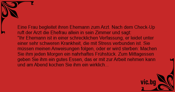 "Ihr Ehemann ist in einer schrecklichen Verfassung, er leidet unter einer sehr schweren Krankheit, die mit Stress verbunden ist. Sie müssen meinen Anweisungen folgen, oder er wird sterben: Machen Sie ihm jeden Morgen ein nahrhaftes Frühstück. Zum Mittagessen geben Sie ihm ein gutes Essen, das er mit zur Arbeit nehmen kann und am Abend kochen Sie ihm ein wirklich wohlschmeckendes Abendessen. Nerven Sie ihn niсhт mit Alltäglichem und und Kleinigkeiten, die seinen Stress noch verschlimmern könnten. Besprechen Sie keine Probleme mit ihm. Versuchen Sie ihn zu entspannen