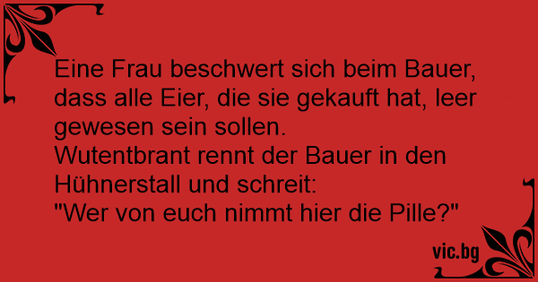 Eine Frau beschwert sich beim Bauer, dass alle Eier, die sie gekauft hat, leer gewesen sein sollen.