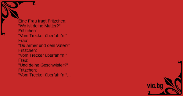 Ruft die Frau Maier an und fragt: "Ist deine Mutter da?" Fritzi am Telefon. "Nein vom Traktor überfahren." "Ist der Papa da?" "Nein vom Traktor überfahren!" "Ist sonst jemand zu Hause?" "Nein die sind alle vom Traktor überfahren!" "Und was machst du???" "Traktor fahrn!!!"