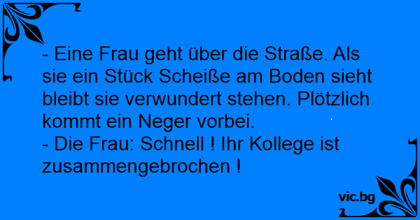 - Eine Frau geht über die Straße. Als sie ein Stück Sсhеißе am Boden sieht bleibt sie verwundert stehen. Plötzlich kommt ein Nеgеr vorbei.