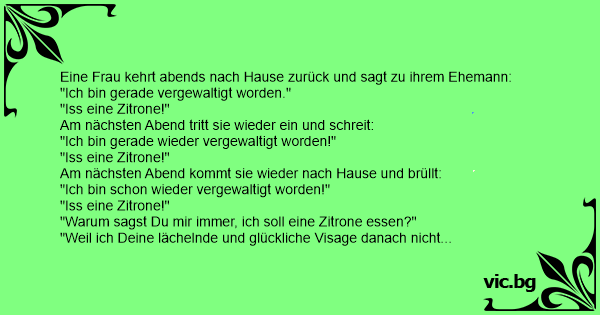 Калугерки в церкви: - батюшка, что делать? - изнасиловали, изверги... -... Монахиня споделя с игуменката: Приходит девушка к священнику на исповедь: Отива девойка в църквата: Eine junge Nonne geht zur Schwester Oberin und beichtet von einem Fehltritt und erbittet Vergebung. Sagt die Schwester Oberin: "Geh in die Küche und trinke ein Glas Zitronensaft" "Ist mir denn dann vergeben ?" "Nein, aber das hämische Grinsen wohl aus deinem Gesicht!" Une nonne arrive en courant dans la cuisine du couvent pour y retrouver la Mère supérieure. Elle crie: "J'ai été violée! J'ai été violée!" La Mère supérieure lui répond: "Calmez-vous mon enfant, et... Den unga nunnan berättade för abbedissan att hon hade blivit förförd. - Drick citronsaft, rådde abbedissan. - Hjälper det? - Nä, men det tar i alla fall bort den där belåtna minen. W klasztorze nagle otwierają się drzwi i z rozpędem do środka wpada młoda zakonnica. Biegnie prosto do matki przełożonej: - Matko przełożona, matko przełożona, zgwałcili mnie, co robić? - Zjeść... Una ragazza corre dalla mamma: - Mamma mamma, sono stata violentata. - Vai in cucina e mangiati un limone risponde la madre. - Mi farà ritornare come prima ? - No, ma almeno ti toglierà... Влегува калуѓерка кај игуменката и и вика: - Замисли мајко, одев низ шумата и наиде еден гад и ме силуваше. Што да правам? - Не грижи се ќерко, само оди и изеди три лимуна. - Зар ќе помогне тоа? -...