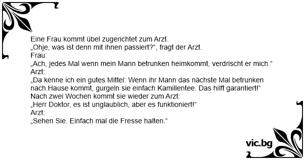 Eine Frau kommt übel zugerichtet zum Arzt. „Ohje, was ist denn mit ihnen passiert?“, fragt der Arzt. Frau: „Ach, jedes Mal wenn mein Mann betrunken heimkommt, verdrischt er mich.“ Arzt: „Da kenne ich ein gutes Mittel: Wenn ihr Mann das nächste Mal betrunken nach Hause kommt, gurgeln sie einfach Kamillentee. Das hilft garantiert!“ Nach zwei Wochen kommt sie wieder zum Arzt: „Herr Doktor, es ist unglaublich, aber es funktioniert!“ Arzt: „Sehen Sie. Einfach mal die Fresse halten.“