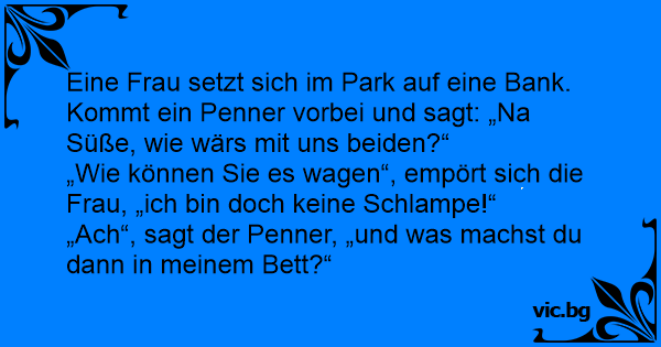 Eine Frau setzt sich im Park auf eine Bank. Kommt ein Реnnеr vorbei und sagt: „Na Süße, wie wärs mit uns beiden?“