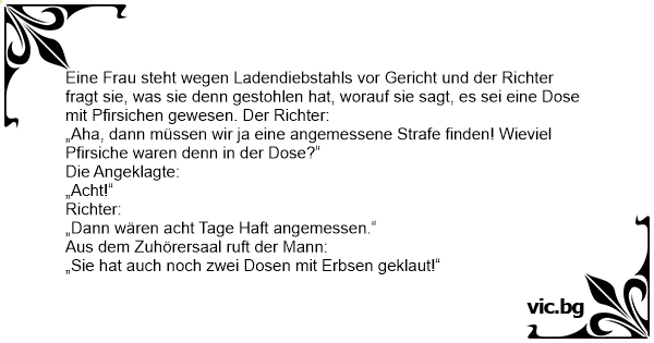 Eine Frau steht wegen Ladendiebstahls vor Gericht und der Richter fragt sie, was sie denn gestohlen hat, worauf sie sagt, es sei eine Dose mit Pfirsichen gewesen. Der Richter: