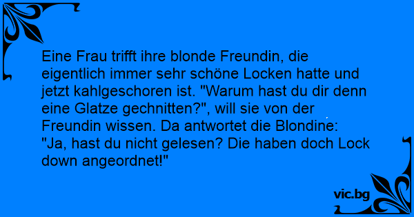 Eine Frau trifft ihre blonde Freundin, die eigentlich immer sehr schöne Locken hatte und jetzt kahlgeschoren ist. "Warum hast du dir denn eine Glatze gechnitten?", will sie von der Freundin wissen. Da antwortet die Blondine: