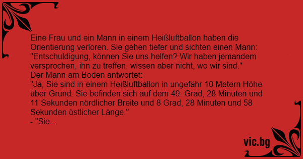 - "Sie verfügen offensichtlich über Fachwissen, haben wohl eine solide wissenschaftliche Ausbildung", ruft einer der beiden aus dem Ballon. "Stimmt", antwortet der Mann. "Woher wissen Sie das?"