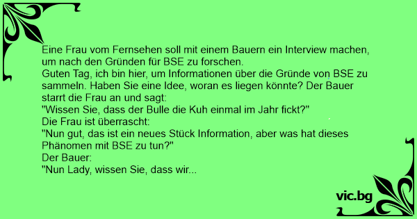 Eine Reporterin fragt einen Bauer: "Was glauben Sie, ist die Ursache für den Rinderwahnsinn?" Bauer: "Naja, wie oft glauben Sie, wird die Kuh vom Bullen gerammelt." Reporterin: "Naja, höchstens einmal im Jahr, denk ich." Bauer: "Und wie oft wird die Kuh gemolken?" Reporterin: "Naja, vielleicht...
