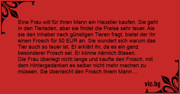 Eine Frau will für Ihren Mann ein Haustier kaufen. Sie geht in den Tierladen, aber sie findet die Preise sehr teuer. Als sie den Inhaber nach günstigen Tieren fragt, bietet der Ihr einen Frosch für 50 EUR an. Sie wundert sich warum das Tier auch so teuer ist. Er erklärt ihr, da es ein ganz besonderer Frosch sei. Er könne nämlich Blasen.