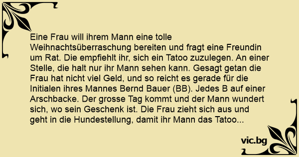 Eine Frau will ihrem Mann eine tolle Weihnachtsüberraschung bereiten und fragt eine Freundin um Rat. Die empfiehlt ihr, sich ein Tatoo zuzulegen. An einer Stelle, die halt nur ihr Mann sehen kann. Gesagt getan die Frau hat niсhт viel Geld, und so reicht es gerade für die Initialen ihres Mannes Bernd Bauer (BB). Jedes B auf einer Arschbacke. Der grosse Tag kommt und der Mann wundert sich, wo sein Geschenk ist. Die Frau zieht sich aus und geht in die Hundestellung, damit ihr Mann das Tatoo sehen kann. Der fängt plötzlich an, sie tierisch zu verprügeln. Dabei schreit er immer wieder: