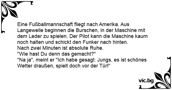 Eine Fußballmannschaft fliegt nach Amerika. Aus Langeweile beginnen die Burschen, in der Maschine mit dem Leder zu spielen. Der Pilot kann die Maschine kaum noch halten und schickt den Funker nach hinten.