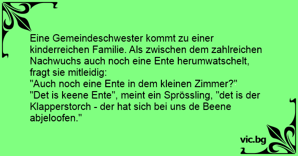 Eine Gemeindeschwester kommt zu einer kinderreichen Familie. Als zwischen dem zahlreichen Nachwuchs auch noch eine Ente herumwatschelt, fragt sie mitleidig: